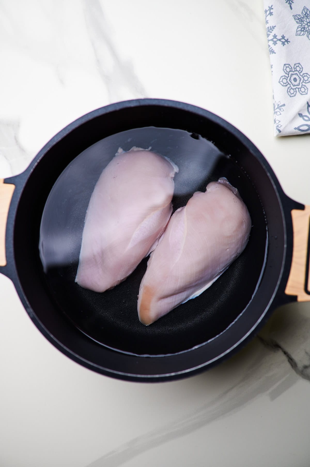 - Put the chicken breasts in a saucepan big enough to accommodate them and the water, leaving at least an inch of room. Pour water over it. Put the salt in there. Bring to a boil over medium-high heat, then lower the heat to a simmer.