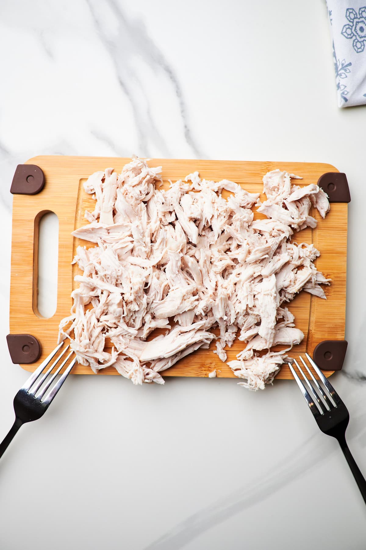 - Chicken can be shredded, sliced, or chopped as needed. You can either put the chicken in the bowl of your stand mixer or shred it with two forks.