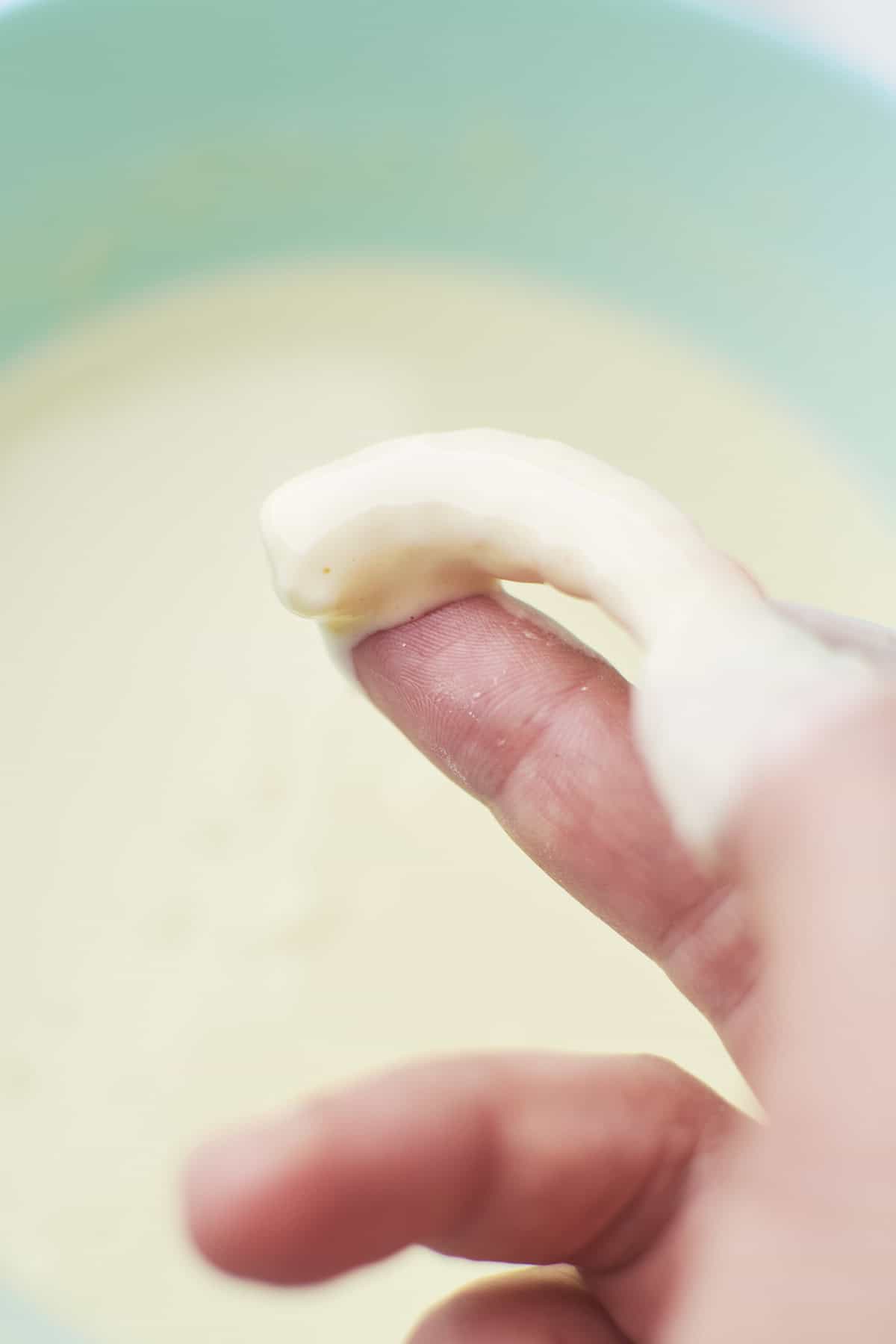- I prefer to use my hands because I like the batter to stay on the shrimp better, but feel free to use a fork if you would rather lower the shrimp into the fat.