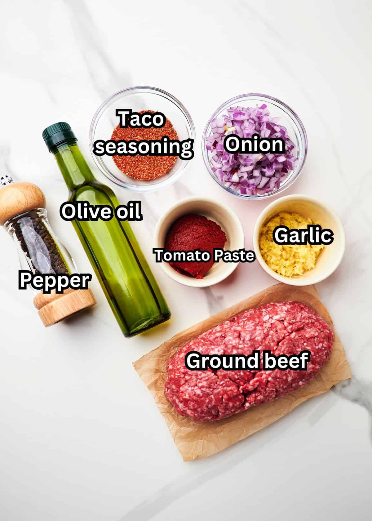 - Ground beef - The main feature of this recipe, delivering a juicy protein-packed base to soak up all of the amazing seasonings and flavors. And it makes for an absolutely killer filling for tacos, making them all hearty and filling.